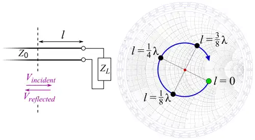 Uma linha de transmissão que é terminada em alguma impedância, ZL, que é diferente da impedância característica, Z0, resultará numa onda sendo refletida a partir da terminação e de volta para a fonte. Na entrada, em direção à linha, a tensão refletida soma-se à tensão incidente e a corrente refletida é subtraída (porque a onda está viajando na direção oposta) da corrente incidente. O resultado é que a impedância de entrada da linha (relação da tensão pela corrente) difere da impedância característica e, para uma linha de comprimento l, é dada por; [7]