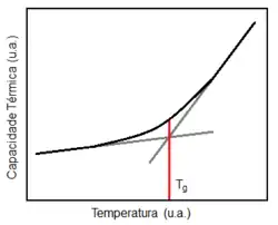 Determinação da Tg por técnica de DSC (calorimetria diferencial de varredura), mostrando a capacidade térmica em função da temperatura. A Tg é o ponto de intersecção das retas cinzas. (u.a. = unidades arbitrárias)