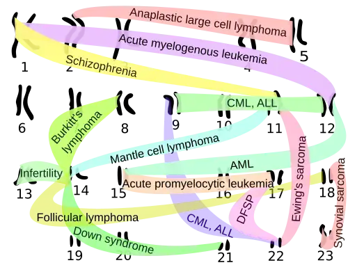 Visão geral sobre as translocações cromossômicas envolvidas em câncer e em algumas outras condições, como a esquizofrenia, com os cromossomos organizados no padrão do cariótipo. Abreviaturas: