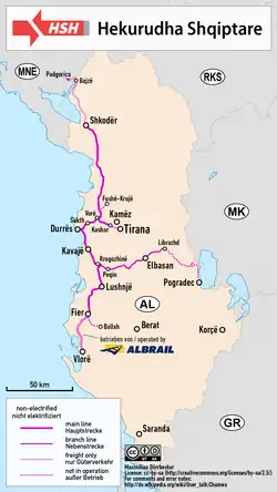 - ↑ Hekurudha Shqiptarë (2009). «Length of tracks - end of year». União Internacional de Caminhos de Ferro. Consultado em 11 de setembro de 2020