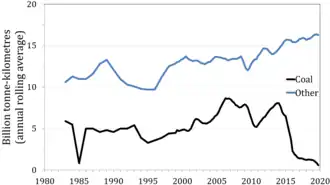 - ↑ Amusan, Folusho (21 de maio de 2015). «Freight Rail Usage 2014–15 Quarter 4 Statistical Release» (PDF) (em inglês). Office of Rail and Road. Consultado em 21 de julho de 2015