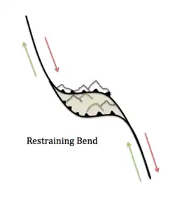 Uma dobra-falha ocorre quando segmentos individuais de uma falha se sobrepõem e se conectam.[3] As estruturas formadas ao longo da falha transcorrente dependem do sentido do deslizamento. Quando uma falha sinistral desliza para a direita ou uma falha dextral desliza para a esquerda, forma-se uma curva de retenção.[2][4]:1 Essas áreas apresentam relevo positivo (elevação topográfica), encurtamento crustal e exumação do embasamento cristalino. Em afloramentos profundamente erodidos ou em levantamentos geofísicos subsuperficiais, as curvas de retenção costumam definir estruturas em flor positivas.[4]:13 Em vista planar, elas formam duplexes contracionais de rejeito direcional, com falhas contracionais subparalelas reversas ou de rejeito oblíquo, limitadas por dois segmentos de rejeito direcional. As curvas de retenção são comuns na superfície terrestre, desde exemplos em escala de subafloramento até cadeias montanhosas de grande escala. Há hipóteses de que estas ocorram em corpos extraterrestres, como a lua gelada de Júpiter, Europa, e em Vênus.[5]