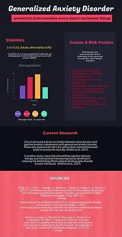 É normal e útil ter ansiedade, mas nesse transtorno a preocupação é tão excessiva que prejudica as diversas áreas da vida (profissional, familiar, social e acadêmica). Os muito ansiosos constantemente imaginam desastres relacionados a saúde, dinheiro, morte, problemas de família e problemas sociais.[2]