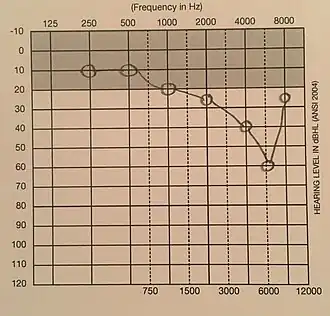 Pode ser uni ou bilateral e acontecer em qualquer idade.[9] A curva audiométrica é, inicialmente, descendente, podendo haver entalhe amplo e profundo em 4 kHz quando novas exposições acontecem[9] Além disso, a perda auditiva afeta principalmente as frequências altas, como 3, 4 e 6 kHz.[10][11]