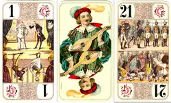 - A excuse, "desculpa", uma carta marcada com uma estrela e representando um tocador de bandolim. Ele desempenha um papel equivalente ao do curinga do pôquer (este último foi inventado muito mais tarde[carece de fontes] )