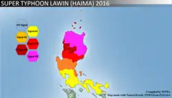 - ↑ «Tropical Cyclone Alert: Typhoon "Lawin" [Haima] Severe Weather Bulletin #1». PAGASA. 17 de outubro de 2016. Consultado em 20 de outubro de 2016. Arquivado do original em 21 de outubro de 2016