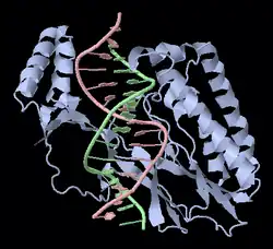 - ↑ Kamada, K.; Horiuchi, T.; Ohsumi, K.; Shimamoto, N.; Morikawa, K. (1996). «Structure of a replication-terminator protein complexed with DNA». Nature. 383 (6601): 598–603. Bibcode:1996Natur.383..598K. PMID 8857533. doi:10.1038/383598a0