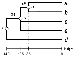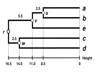 denota o nó (raiz) ao qual e estão agora conectados. Os ramos que unem e a têm então comprimentos: