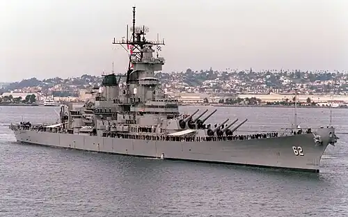 | Armamento | 9 canhões de 406 mm 12 canhões de 127 mm 32 RGM-109 Tomahawk 16 RGM-84 Harpoon 4 Phalanx CIWS de 20 mm |