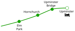 A principal rota de caminhada do London Loop passa fora da estação e forma o ponto final da seção 22 de Harold Wood e o ponto inicial da seção 23 para Rainham.[17][18] A estação está localizada na extremidade leste da linha District e é a penúltima estação antes do terminal em Upminster.[19] A estação Upminster fica a 1,24 kilometres (0,77 mi) a leste da estação e Hornchurch fica 1,26 kilometres (0,78 mi) para o oeste.[20]