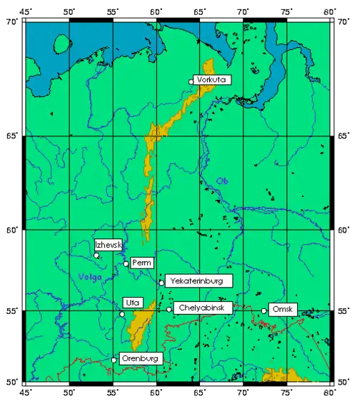 - ↑ a b "Ural (geographical)". Grande Enciclopédia Soviética. Arquivado do original em 18 de setembro de 2014. Acessado em 31 de maio de 2016.