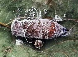 A fase pupal dura de uma a três semanas, e mede cerca de 20 mm; sua cor inicial é esverdeada até tornar-se marrom, coberta com secreção cerosa alva.[1] Para abrigar-se nesta fase ela dobra uma folha a partir das margens, formando uma câmara da qual saem eventualmente para se alimentar.[2]