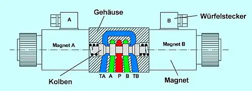 - número de conexões ou vias: são todas as entradas e saídas de fluido na válvula. A identificação usual das vias é P (entrada do fluido sob pressão), A/B (saídas de utilização ou trabalho) e R (retorno para o reservatório).