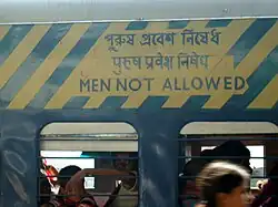 Em toda a Índia, os serviços de trens de longa distância dispõem de compartimentos especiais reservados exclusivamente para mulheres.[carece de fontes] Em Mumbai, a metrópole comercial, todos os trens suburbanos possuem compartimentos destinados exclusivamente a mulheres, embora crianças em idade escolar também possam viajar. Enquanto dois compartimentos funcionam 24 horas por dia para mulheres, um deles é reservado apenas em horários específicos. Esses compartimentos estão disponíveis tanto para viagens em primeira quanto em segunda classe. Além disso, trens denominados "Ladies' Special" foram introduzidos nos horários de pico, reservando o trem inteiro para mulheres. Durante esses períodos, há de três a quatro serviços especiais exclusivos para mulheres. Com o número de mulheres necessitando viajar dobrando nos anos 2000, a demanda por esses serviços é muito alta.[20] Diversos serviços ferroviários oferecem vagões exclusivos para mulheres, como o Metrô de Mumbai e o Metrô de Delhi.[21] Essa demanda inclusive originou serviços de táxi e de riquixá exclusivos para mulheres.[22]