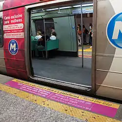 Em abril de 2006, o Metrô do Rio de Janeiro implementou a determinação estabelecida por lei estadual, aprovada no mês anterior, que destinava vagões de passageiros específicos às mulheres para evitar o assédio sexual. Em trens com seis vagões, um deles é identificado com cores rosas como exclusivo para mulheres, sendo essa restrição aplicada de segunda a sexta-feira durante os horários de pico, entre 06:00 e 09:00 e entre 17:00 e 20:00. A polícia do metrô atua para impedir que homens embarquem no vagão reservado, e a plataforma exibe uma sinalização no piso indicando o ponto de embarque para os vagões exclusivos para mulheres.[2]