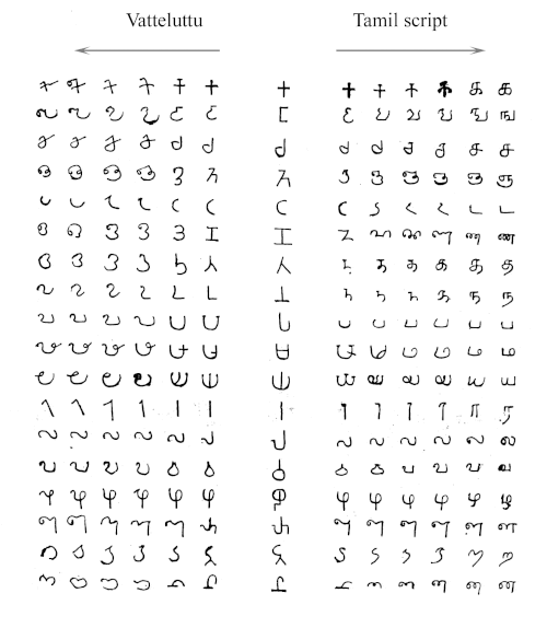 Na esquerda: Tabela mostrando a evolução do tâmil e do vattelluttu (o mais primórdio fica perto do centro e sua evolução segue em direção aos lados); O tâmil-brahmi está na coluna central, o vattelluttu está à esquerda e o tâmil está à direita. Na direita: Caracteres usados em vattelluttu.