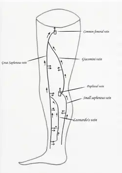 - ↑ Pourandokht Khodabakhsh, Konstantinos T. Delis; Alison L. Knaggs. «Prevalence, anatomic patterns, valvular competence, and clinical significance of the Giacomini vein». Journal of Vascular Surgery. 40 (6): 1174–1183. doi:10.1016/j.jvs.2004.09.019