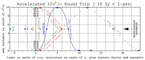 Estas equações descrevem algumas consequências da viagem acelerada em alta velocidade. Por exemplo, imagine uma nave espacial que possa acelerar seus passageiros a 1 g (ou 1,03 anos-luz/ano2) a meio caminho de seu destino e, em seguida, desacelerá-los em 1 g para a metade restante, de modo a fornecer gravidade artificial semelhante à da Terra a partir do ponto A ao ponto B no menor tempo possível. Para uma distância no mapa de ΔxAB, a primeira equação acima prevê um fator de Lorentz de ponto médio (acima do seu valor unitário de repouso) de γmid=1+α(ΔxAB/2)/c2. Portanto, o tempo de ida e volta nos relógios viajantes será Δτ = 4(c/α)cosh−1[γmid], durante o qual o tempo decorrido nos relógios dos mapas será Δt = 4(c/α)sinh[cosh−1[γmid]].