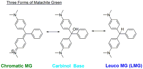 As estruturas dos compostos explicam certas propriedades químicas e biológicas, tais como como podem ser absorvidos no corpo e quão reativo eles são. O verde malaquita é comumente conhecido em uma forma chamada cromática na qual é um corante verde. Entretanto, como ele é absorvido pelo corpo, é convertido pelos mecanismos corporais em outras formas que são igualmente importantes para serem consideradas. A primeira forma é chamada a forma carbinol, a qual é importante porque ela permeia pelas membranas das células mais rapidamente. Quando está dentro da célula, ela é metabolizada em uma forma chamada leuco-verde malaquita. Esta forma é conhecida pelos pesquisadores por ser tóxica em adição ao fato que é retida pelo corpo por um longo período que a forma cromática do verde malaquita.