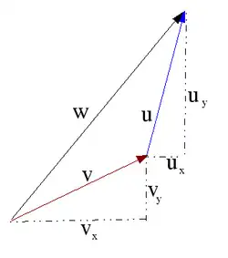 A decomposição dos vetores nos seus componentes horizontais e verticais, nos revela componentes de triângulos retângulos, nos quais podemos observar claramente a propriedade da adição[5] dos vetores.