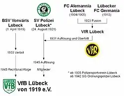 A origem remonta a um par de predecessores. Ballsportverein Vorwärts Lübeck estabelecido a 1 de abril de 1919 e Sportvereinigung Polizei Lübeck, fundado dois anos mais tarde. Este último era o clube desportivo da polícia local. Em 1931, houve a fusão com o Verein für Rasensport Lübeck, que era o produto da união ocorrida em 1923 entre o Fußball Clube Alemannia 1905 Lübeck e Fußball Lübecker Clube Germania 1913. O SVP jogou bem o suficiente para ganhar aparições nas rodadas do play-off do circuito norte, mas não dispôs de sucesso. Já o VfR fez apenas uma aparição, em 1924. Já o BSV Vorwärts Lübeck, em 1933, acabou desmantelado pelo Regime Nazista, o qual considerava os clubes desportivos como compostos de trabalhadores do tipo politicamente indesejáveis. Membros da agremiação se tornaram parte do SVP e a associação já expandida juntou-se à Nordmark Gauliga, uma das dezesseis máximas divisões criadas pelos nazistas em 1933. O clube foi rebatizado Polizei Sportverein Lübeck, em 1935, e jogou na Nordmark Gauliga até 1942. A equipe teve o terceiro lugar como melhor resultado na classificação. O PSV fez aparições sem êxito, em comparação com o predecessor. Em 1942, foi novamente renomeado, tornando-se Sportgemeinschaft der Ordnungspolizei Lübeck, passando a atuar na Gauliga Schleswig-Holstein, quando as condições de guerra forçaram a dissolução da Gauliga Nordmark em mais três divisões locais.