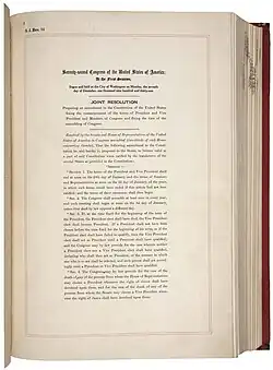 O 72º Congresso [en] propôs a Vigésima Emenda em 2 de março de 1932, e a emenda foi ratificada pelos seguintes estados. Foi adotada em 23 de janeiro de 1933, depois que 36 estados, ou seja, três quartos dos 48 estados existentes na época, ratificaram a Emenda.[11][12]