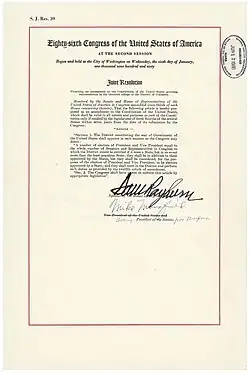 - ↑ «Senate passed bill proposing constitutional amendments on filling vacancies in House, poll tax, and D.C. right to vote, and took up bill on school construction.» (PDF). CONGRESSIONAL RECORD - DAILY DIGEST. 2 de fevereiro de 1960. Consultado em 10 de julho de 2024