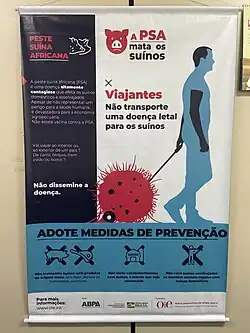 Nos portos e aeroportos, foram distribuídos diversos banners informativos e alertas sonoros são emitidos para chamar a atenção de passageiros que possam ter visitado áreas de risco ou que trazem produtos de origem suína, para que declarem essas ocorrências ao VIGIAGRO na chegada ao Brasil.[10]