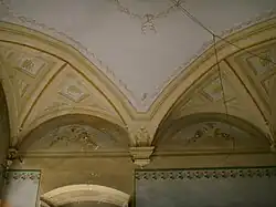 O pátio interno, com colunas em três dos lados, foi redecorado, sobretudo no lado fechado, com novas cornijas e arcos fingidos, enquanto dentro do edifício foi criado um sumptuoso salão afrescado com cenas paisagísticas enquadradas por estuques. A decoração actual do salão remonta aos trabalhos de Contestabile, o qual afrescou uma série de Paesaggi (Paisagens) em 1805.