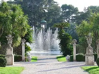 - O Jardim à francesa, visível dos salões, ocupa a parte central dos jardins. É composto por um espelho de água central e está rodeado por tanques laterais e plantações dispostas simetricamente. Os tanques são embelezados por jacintos de água. É dominado por um Templo de Amor e por uma cascata com degraus. É preciso realçar o exotismo que se desprende do conjunto através das palmeiras phœnix canariensis e brahea armata, ou mexican blue palm, das cicas revoluta do Japão, cordyline australis hook, dasylirions, abacateiro, figueiras, laranjeiras, e kumquats que ladeiam glicínias arbustivas. Este quadro bucólico é embelezado por jogos de água que disparam a cada vinte minutos ao som de diferentes trechos de música clássica.