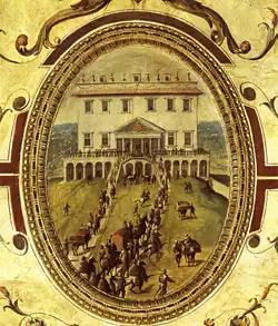 "O cortejo de Leonor de Toledo entra em Poggio a Caiano", afresco de Giovanni Stradano no Palazzo Vecchio.