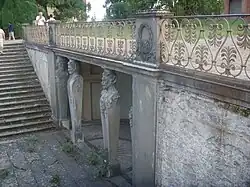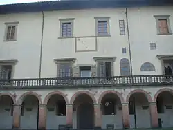 O corpo do edifício é circundado por um terraço arcado. No alto das escadas encontra-se uma loggia encimada por um tímpano e por uma abóbada de berço finamente decorada em relevo. Na parede direita da loggia encontra-se uma decoração a fresco representando o Sacrificio di Lacoonte, de Filippino Lippi.