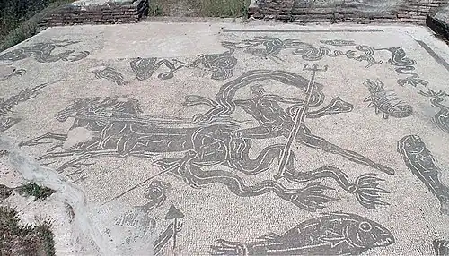 Através de uma pequena escada posicionada no ângulo sudoeste do peristilo se chega ao vestíbulo do ambiente das termas, cujo piso está decorado por um mosaico de tesselas pretas e brancas representando Netuno em seu carro puxado por cavalos-marinhos. A cena, que se desenvolve no entorno do deus posicionado centralmente, apresenta: dois anunciadores, um feminino com um sistro (um antigo instrumento de origem egípcia) e um outro masculino com uma flauta; uma figura feminina com uma cauda de peixe que segura nas mãos um tirso (um longo bastão com uma pinha na ponta) e vários animais marinhos, entre eles cavalos-marinhos, um leão-marinho, uma lagosta, um camarão, alguns peixes e um golfinho. Com base na comparação com o mosaico das Termas de Netuno, em Óstia Antiga, é de cerca de 139. Para nordeste do vestíbulo se abrem dois pequenos vestiários (apoditérios)[3]. O recinto mais para o oeste abriga uma estrutura circular que pode ter sido um tanque de peixes[2]. Pelo lado nordeste se chega à região para o banho em água fria (frigidário), com um tanque semicircular a nordeste e, provavelmente, três outros, menores e retangulares. Dali se chega à zona mais morna (tepidário), que servia de passagem entre o frigidário e o caldário, com seu grande tanque retangular e revestido de mármore nas paredes. Os ambientes para os banhos quentes (caldários), a sudeste, era aquecido por uma fornalha (prefúrnio)[3].