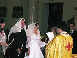 Na Igreja Ortodoxa Oriental, o casamento é encarado como um Mistério Sagrado (sacramento) e como uma ordenação. Serve para unir um homem e uma mulher em união eterna diante de Deus.[50][51][52] Refere-se aos primeiros séculos da igreja, quando a união espiritual de cônjuges no primeiro casamento sacramental era eterna.[52][53] Portanto, é considerado um martírio à medida que cada cônjuge aprende a morrer para si mesmo pelo bem do outro. Como todos os Mistérios, o casamento ortodoxo é mais do que apenas uma celebração de algo que já existe: é a criação de algo novo, a concessão ao casal da graça que os transforma de 'casal' em marido e esposa dentro do Corpo de Cristo.[54]