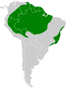 Ocorre em Bolívia, Brasil, Colômbia, Equador, Guiana Francesa, Guiana, Peru, Suriname e Venezuela.[1]