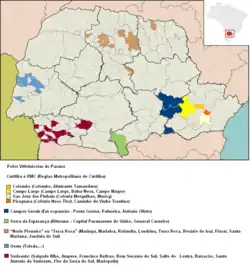 O oeste e sudoeste têm grande importância, porém, em uma atividade voltada mais para a produção de vinhos. A Região Metropolitana de Curitiba (RMC) também conta com uma boa produção, principalmente Colombo, Campo Largo e São José dos Pinhais. Exceto pelo litoral, em todas as outras regiões há presença da vitivinicultura. Entre as uvas com maior presença no Estado estão as variedades Itália, Rubi, Benitaka e Brasil. Entre as uvas rústicas, as mais produzidas são a Niágara rosada e branca e Tercy (Ives Noir).