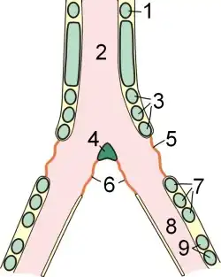 A traquéia é coberta por anéis parcialmente ossificados conhecidos como anéis traqueais. Os anéis traqueais são completos, enquanto que os anéis bronquiais são em formato de C. Os últimos anéis traqueais e os primeiros anéis bronquiais podem se fundir no que é chamado caixa timpânica. Na base da traqueia e na junta dos brônquios há uma estrutura dorsiventral, o pessulo, que pode ser desenvolvido em vários níveis. O pessulo é uma cartilagem em passariformes e fornece fixação as membranas. A membrana que forma parte dos primeiros três anéis bronquiais é responsável por vibrar e produzir o som na maioria dos passeriformes. Essas membranas também podem ser ligadas ao pessulo. Outros músculos também estão envolvidos com o controle da siringe, e eles podem ser extrínsecos ou intrínsecos dependendo do modo como estão ligados a siringe.[4]