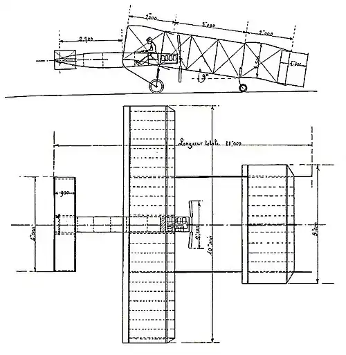 Alimentado por um motor Antoinette V8 de 50 HP,[9] era um biplano de dois lugares de configuração por impulsão e envergadura de 10 m. Um profundor biplano estava posicionado na frente das asas na extremidade de uma pequena nacele (configuração "canard") e uma empenagem biplano semelhante a uma "boxkite" com metade da envergadura das asas principais com três superfícies verticais, cada uma carregando um leme no bordo traseiro, sendo presa a longarinas atrás das asas.[10] O trem de pouso consistia em um par de rodas com apoios em "V" sob a borda de fuga das asas e pequenas rodas montadas nas extremidades das longarinas traseiras inferiores. Não havia provisão para controle lateral direto.[nota 5] Antes das demonstrações de voo de Wilbur Wright na França em agosto de 1908, a importância do controle de "rolagem" para fazer curvas controladas não era apreciada pelos experimentadores europeus, que se concentravam na tentativa de produzir aviões inerentemente estáveis e práticos.[nota 6]