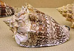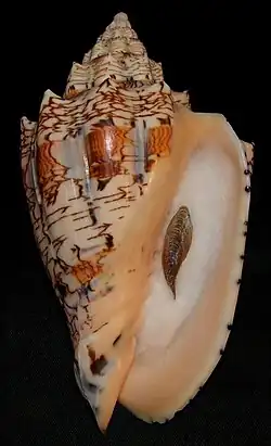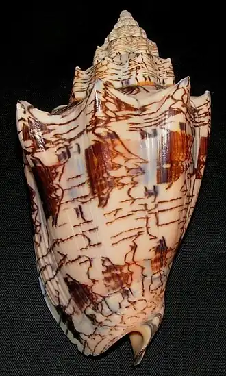 A concha dessa espécie é robusta, com espira moderadamente alta, de até 7 voltas e protoconcha arredondada, comumente com 100 a 150 mm de comprimento,[14] mas podendo atigir 180 mm[3][11][15] ou até 200 mm.[16] Sua superfície apresenta coloração creme e diversos desenhos característicos de coloração marrom e laranja a marrom-avermelhada, dotada de esculturas de crescimento visíveis, em protuberâncias pontiagudas, fortes e destacadas, dirigidas para a espira; chegando até sua volta final (9 a 11), que apresenta abertura longa e moderadamente estreita, angular, ocupando 2/3 de toda a concha (quase a totalidade do seu comprimento). Apresenta opérculo córneo ocupando 1/4 da abertura, quando vista por baixo, e esta possui um lábio externo levemente espessado e columela curva, com nove a onze fortes pregas oblíquas. O canal sifonal é curto e afunilado.[2][11][17] Segundo alguns autores, existe dimorfismo sexual nesta espécie de caramujo, cuja concha das fêmeas é mais nodulosa e alargada que a dos machos, e nestes ela também é mais lisa e alongada.[2][9]