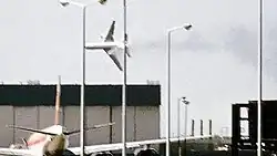 ![]() O voo 191 pouco depois da decolagem e antes de cair, com seu motor esquerdo perdido e fluido hidráulico vazando. Fotografia de Michael Laughlin | |