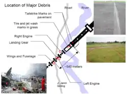 A aeronave então atingiu várias luzes de aproximação localizadas no final da pista antes de passar pela grama, cruzar um pequeno rio e cair na movimentada estrada Djamin Ginting. Espectadores e motoristas na estrada entraram em pânico quando a aeronave se aproximou deles. A asa esquerda atingiu um prédio e a aeronave explodiu em chamas. Ela se partiu em três seções. Passageiros na fuselagem traseira afirmaram que a parte dianteira da aeronave foi obliterada quando a aeronave explodiu.[15] A fuselagem continuou a percorrer a estrada, atingindo vários carros, bicicletas, linhas de energia e postes de iluminação e destruindo várias lojas e casas.[16] Vários motoristas desatentos tiveram seus veículos capotados pela aeronave em movimento e, posteriormente, pegaram fogo.[17] A fuselagem traseira então parou no meio da estrada.[1]