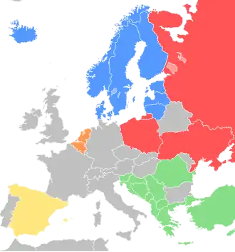 - o Bloco Nórdico, formado pela Dinamarca, Finlândia, Islândia, Noruega e Suécia, às vezes juntamente com os estados dos Balcãs ou com os Países Bálticos.