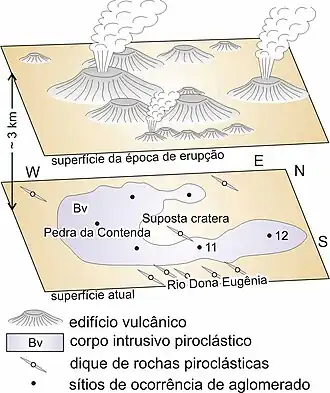 A maioria dos trabalhos apresentado antes de 2006 [2][8][9] [11][30][38][40] interpretaram as rochas piroclásticas que ocorre na Pedra da Contenda e seus arredores como constituintes de fluxo piroclástico. Esses autores apontaram a estrutura acamada como um importante argumento. Entretanto, o grau de desenvolvimento e continuidade é muito baixo, sendo incompatíveis com os perfis de um fluxo piroclástico.[6] Por outro lado, as rochas piroclásticas presentes ao longo do Rio Dona Eugênia ocorrem como diques piroclásticos de largura métrica, apresentando posicionamento geológico subterrâneo como condutos e fissuras subvulcânicas. Se as rochas piroclásticas fossem de fluxos piroclásticos, os depósitos deveriam estar presentes em uma ampla área da Baixada Fluminense, tais como Mesquita, Nilópolis, Nova Iguaçu e Duque de Caxias. Os depósitos piroclásticos soldados são resistentes à erosão, portanto facilmente identificados. Entretanto, não se encontram tais depósitos vulcânicas na Baixada Fluminense.[6] Este fato confirma que as rochas piroclásticas não são formadoras de fluxos piroclásticos.