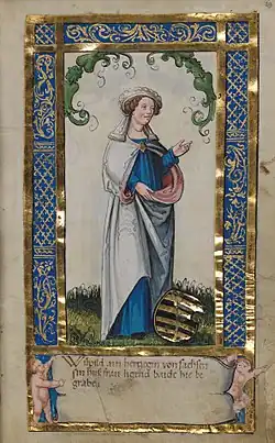 ![]() Representação da duquesa Vulfilda no manuscrito iluminado Weingartener Stifterbüchlein, c. 1510. | |