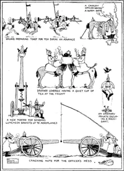 - ↑ Bryant, Mark (2006). World War I in Cartoons. London: Grub Street. p. 17. ISBN 190494356X
