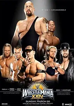 ![]() Pôster promocional do evento, apresentando de cima para baixo, da esquerda para a direita, Big Show, Floyd Mayweather Jr., Triple H, Randy Orton, John Cena, Edge e The Undertaker. | |||