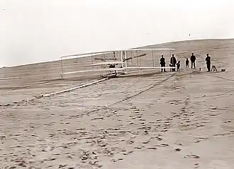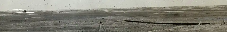 - ↑ "The Five First Flights." thewrightbrothers.org. Retrieved: July 23, 2008 Citação: "Vista distante da aeronave Wright logo depois do pouso, obtida do ponto de partida..." Uma análise detalhada da foto indica que o Flyer ainda estava voando, cerca de 17 segundos de voo, aproximadamente 76 m distante do fim dos trilhos de lançamento a uma altura de cerca de 3 m, faltando cerca de 183 m e 42 segundos para finalizar o voo".