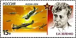 ![]() Um carimbo postal russo de 2014 com o retrato de Zelenko e da sua última acção em combate | |
