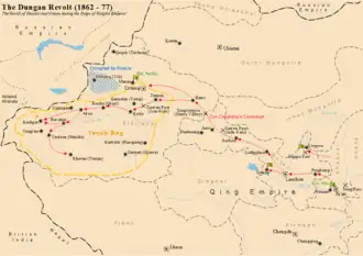 No final da década de 1870, os Qing decidiram reconquistar Xinjiang com Zuo Zongtang, anteriormente um general do Exército Xiang, como comandante-em-chefe. Seus subordinados eram o general Han Liu Jintang e o líder Manchu Jin Shun.[26]:240 Quando o General Zuo avançou para Xinjiang para esmagar os muçulmanos sob o comando de Iacube Begue, ele foi acompanhado pelo General Sufi Khufiyya Dungan Ma Anliang e suas forças, que eram compostas inteiramente por muçulmanos Dungan.[27] Além disso, o General Dong Fuxiang tinha um exército composto por Han e Dungan, e seu exército tomou as áreas de Kashgar e Khotan durante a reconquista.[28][29] Os Generais Dungan Gedimu de Shaanxi Cui Wei e Hua Decai, que haviam desertado de volta para os Qing, também se juntaram ao ataque do General Zuo contra as forças de Iacube Begue.[30]