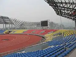 Com capacidade para 25 017 espectadores, o centro esportivo inclui uma piscina padrão com galeria de quinhentos lugares, seis quadras de tênis, seis quadras de basquete, quatro quadras de gateball e instalações relacionadas. O local cobre uma área de 19,47 hectares e o custo total foi de 139 milhões yuan. O estádio principal foi projetado e construído pela Chongqing Vister Construction Engineering Technology Company; a construção foi concluída em 2007.[2]